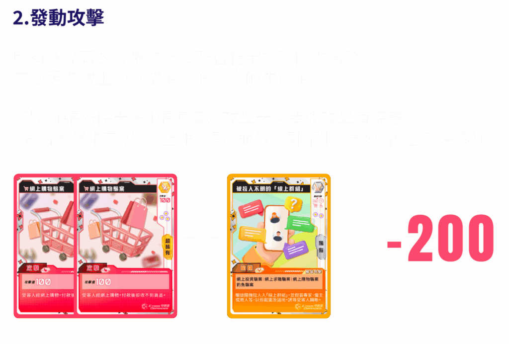 到玩家B的回合,他使出主動激發的技能卡「與親友分享防騙資訊,於當前回合可以從牌庫中抽取額外兩張遊戲卡。